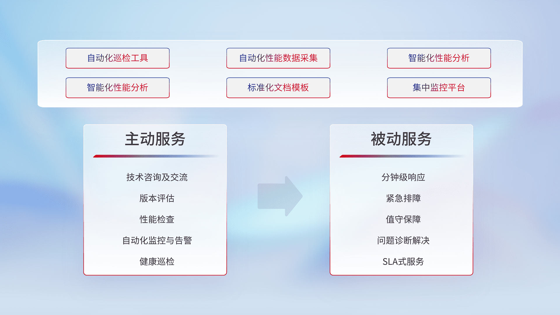 智能化工具和标准化文档,,,保障服务质量,,提供主动服务(包含技术咨询、、版本评估、、、性能检查、、、自动化监控与告警、、、健康巡检)和被动服务包含(分钟级响应、、紧急排障、、、、值守保障、、、问题诊断解决、、、、SLA服务)。。